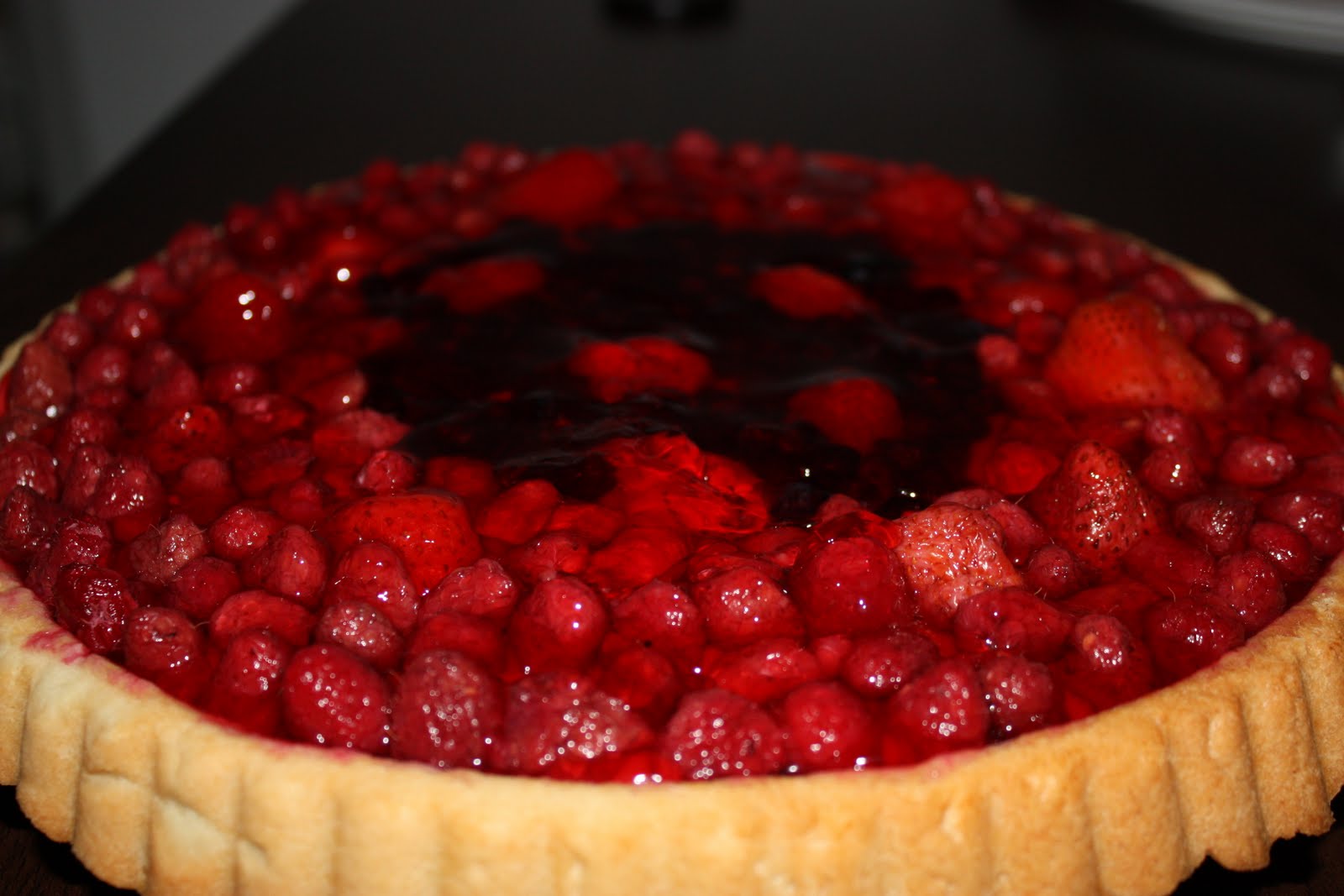 Si ne apucam de asamblat. Turnam crema peste tarta si aranjam fructele, preparam o gelatina rosie conform instructiunilor de pe plic (parerea mea e ca a iesitm cam multa gelatina pentru tarta mea and she drowned:((. Dar e exceptionala si asa:D. Mai lasati asa cateva ore sa se inmoaie aluatul de tarta si puteti manca...asta daca rezistati atata timp:-p.